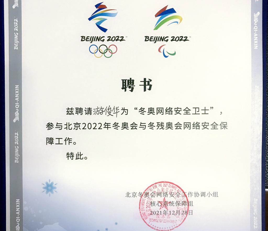 随着北京2022年冬奥会帷幕的落下,冬奥网络安保工作也圆满结束。20余名在校研究生在冬奥独家网络安全服务商、公司产教融合合作企业奇安信集团校外导师协同校内导师联合指导下,深度参与此次冬奥会网络安全保障工作。其中20级研究生游俊华同学凭借扎实的专业技能、良好的综合素养被组委会聘为“冬奥网络安全卫士”。