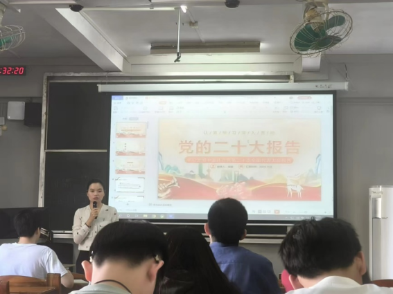 11月8日下午,网安科创研究生党支部书记周莹在西校区教学楼405开展了题为《习近平新时代中国特色社会主义思想和党的二十大精神》的专题党课。她强调了入党动机的重要性,只有具备正确的入党动机,才能持之以恒地为党的事业奋斗。此次专题党课向在场的入党积极分子和发展对象传达了党的二十大报告的核心要义,着重强调了他们所承担的使命和责任,并要求他们始终牢记初心,坚定地向党组织靠拢。